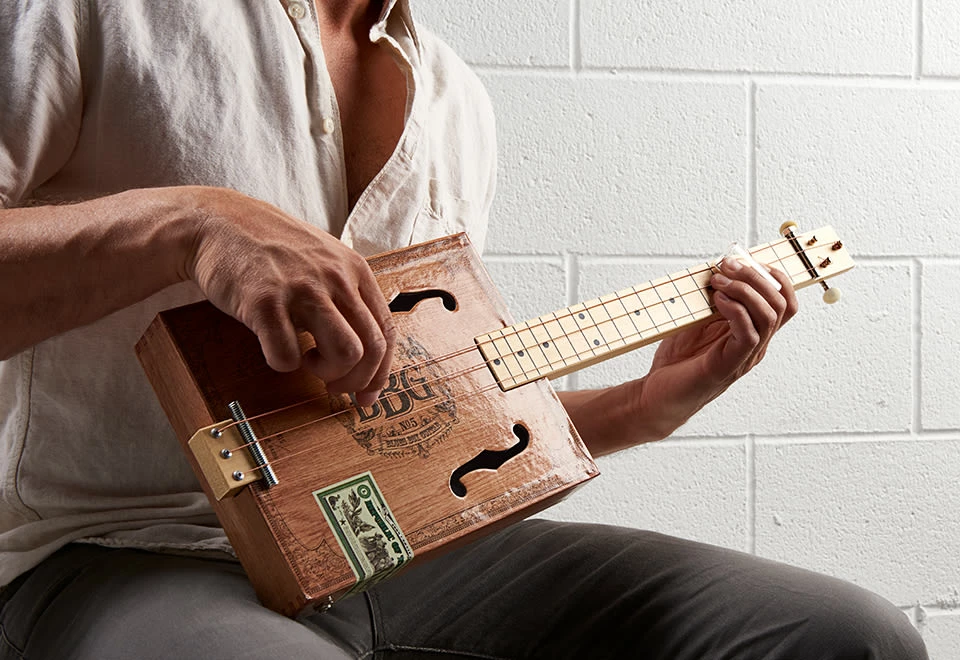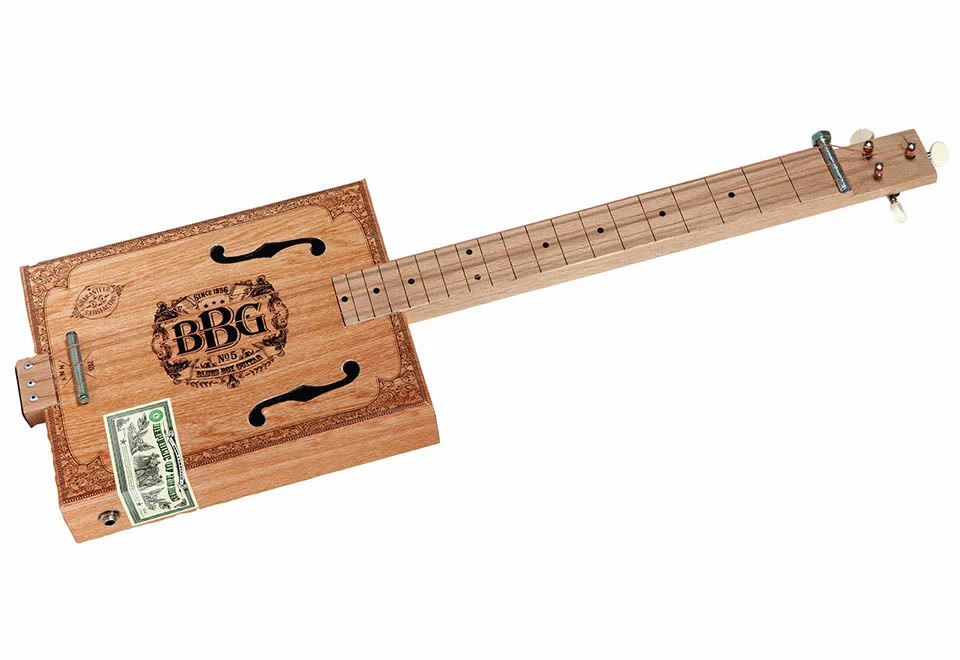 • Includes pre-assembled 3-string fretless slide guitar (featuring a replica cigar box)