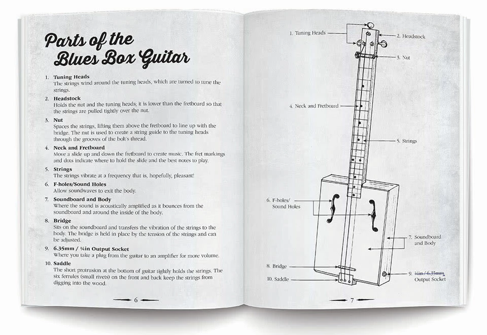 • Lessons include: assembly, tuning, strumming, picking, the Blues scale, Blues riffs, hammer-ons, slide techniques and more