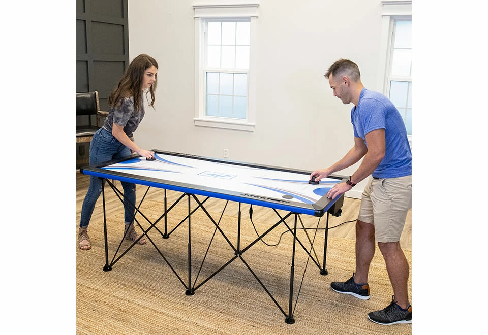 The Foldable Air Hockey Table sets up quickly for instant air hockey fun, with a powerful blower and built-in scorekeeping.